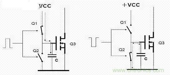 由于MOS管在制造工藝上柵極S的引線的電流容量有一定的限度,所以在Q1在飽和導(dǎo)通時VCC對MOS管柵極S的瞬時充電電流巨大,極易損壞MOS管的輸入端,為了保護(hù)MOS管的安全,在具體的電路中必須采取措施限制瞬時充電的電流值,在柵極充電的電路中串接一個適當(dāng)?shù)某潆娤蘖麟娮鑂,如圖2-3-A所示。充電限流電阻R的阻值的選?。灰鶕?jù)MOS管的輸入電容的大小,激勵脈沖的頻率及灌流電路的VCC(VCC一般為12V)的大小決定一般在數(shù)十姆歐到一百歐姆之間。