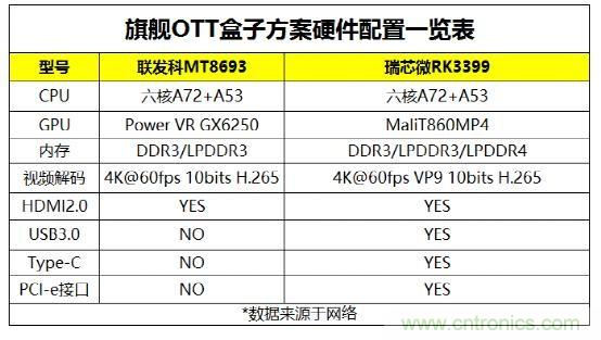 超高規(guī)CPU與GPU,可秒殺目前市場(chǎng)主流的海思Hi3798、海思3798C V200、全志H8、晶晨S905、聯(lián)發(fā)科MT8693等產(chǎn)品。而性能與RK3399差距不算太大的晶晨S912,目前量產(chǎn)時(shí)間仍待定,因此在整體盒子芯片環(huán)境中,RK3399目前尚無對(duì)手。
