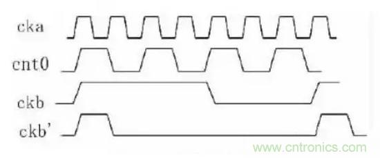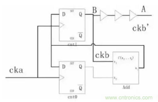 為了方便討論,時(shí)鐘樹(shù)插入以后,假設(shè)A與B之間有1個(gè)ckaCycle的skew;從圖3可以看到如果采用A點(diǎn)作加法器的輸入時(shí)產(chǎn)生的波形是ckb’,采用B點(diǎn)作為輸入時(shí)的波形是ckb,顯然,從例1的代碼來(lái)看,ckb才是正確的。因此必須注意到,如果時(shí)鐘當(dāng)作普通的信號(hào)使用時(shí)可能帶來(lái)的問(wèn)題,這類(lèi)問(wèn)題并沒(méi)有一個(gè)通用的解決辦法。在這個(gè)例子中,不采用時(shí)鐘樹(shù)上的信號(hào)才是正確的,但是在另外一些應(yīng)用中,就必須采用時(shí)鐘樹(shù)上的信號(hào)。比如,時(shí)鐘是CK的兩個(gè)觸發(fā)器中鎖存的數(shù)據(jù)再由CK的高電平和低電平選擇輸出,那么,這個(gè)時(shí)候就需要作為選擇信號(hào)的CK從時(shí)鐘樹(shù)上拉過(guò)來(lái)。因此,如果設(shè)計(jì)中用到了時(shí)鐘信號(hào)作為普通信號(hào)的情況,在后端設(shè)計(jì)時(shí)就必須特殊處理。