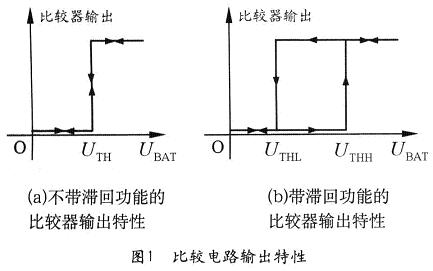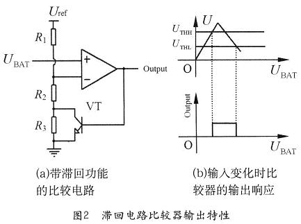但如果在比較電路中設(shè)置兩個(gè)門(mén)限電壓:UTHH和UTHL(UTHH>UTHL),則可以形成一個(gè)滯回區(qū),如圖1(b)所示。當(dāng)電池電壓從低升高至UTHH時(shí),比較器輸出高電平,打開(kāi)電子開(kāi)關(guān),給負(fù)載供電;當(dāng)電池電壓降低至UTHL時(shí),比較器輸出低電平,斷開(kāi)負(fù)載。這個(gè)時(shí)候電池端電壓雖然會(huì)迅速升高至UTHL以上,但由于達(dá)不到UTHH,所以,比較器仍然輸出低電平,負(fù)載仍被斷開(kāi),直到電池被充電后電壓升高至UTHH以上才能再次接通負(fù)載。這樣就避免了電路的振蕩,保護(hù)了負(fù)載和電池。