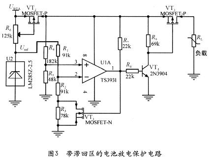 圖3是具體的硬件電路圖,參考電壓由LM285Z一2.5分流穩(wěn)壓器產(chǎn)生,它最低只需要10μA的通過(guò)電流就可輸出穩(wěn)定的2.5V參考電壓,這可大大降低電池在低壓閉鎖狀態(tài)的功耗。比較器選用了ST公司TS393I,它是一種微功耗比較器,這樣,所有分壓電阻的阻值可以選的很大,進(jìn)一步降低了功耗。比較器的輸出控制P溝道的MOSFET、VT3接通或斷開(kāi)負(fù)載。當(dāng)電池電壓降低到一定程度時(shí)VT2關(guān)斷,使得由比較器組成的保護(hù)電路與電池?cái)嚅_(kāi),極大地減小的電池的能量消耗,電池處于一種近似自然放電的狀態(tài);當(dāng)電池電壓恢復(fù)時(shí),VT2自然導(dǎo)通,保護(hù)電路重新恢復(fù)工作。