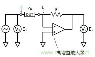 DUT為Device Under Test的縮寫,指測量對象。高增益放大器會自動調(diào)整增益,使通過電阻R的電流與通過DUT的電流相等,DUT 的低電位側(cè)(圖中L一側(cè))一直處于虛擬接地(電位=0)狀態(tài)。此時的輸入電壓E1及輸出電壓E2能測出相位角,如下所示。