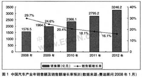 中國汽車產(chǎn)業(yè)的繁榮直接帶動(dòng)了汽車電子產(chǎn)業(yè)的迅速崛起。中國汽車產(chǎn)業(yè)近幾年快速發(fā)展,2007年產(chǎn)量達(dá)到近888.24萬部,僅次于日本和美國,成為世界第三大汽車生產(chǎn)國。下游應(yīng)用市場的快速增長對汽車電子產(chǎn)業(yè)的發(fā)展起到巨大的推動(dòng)作用。