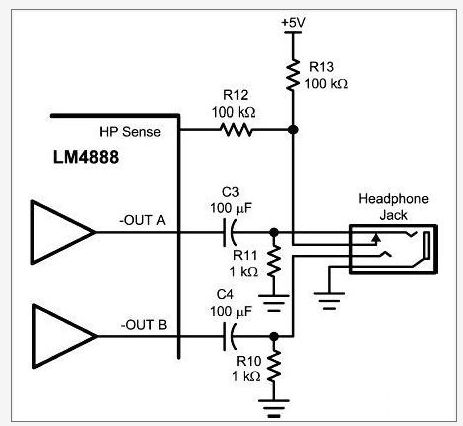 基于每個(gè)耳機(jī)檢測(cè)電路端口設(shè)計(jì)會(huì)採用不同要求,因此,該聲頻子系統(tǒng)提供兩個(gè)獨(dú)立的耳機(jī)(HP)控制輸入接腳。耳機(jī)的允許輸入可啟動(dòng)SE輸出耳機(jī)模式和關(guān)閉BTL輸出模式。耳機(jī)感應(yīng)檢測(cè)輸入需要用一個(gè)常規(guī)立體聲耳機(jī)插孔配合一起使用。剩余的HP邏輯輸入,能允許使用一個(gè)標(biāo)準(zhǔn)邏輯電平(Logic Level)來控制。