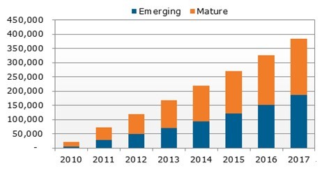 根據(jù)NPD DisplaySearch 季度平板電腦分析報(bào)告Tablet Quarterly指出,到2017年平板電腦出貨量預(yù)計(jì)將從2011年的7千270萬臺上升到3億8千330萬臺。如此快速成長主要源于平板電腦不僅在成熟市場穩(wěn)健增長,且在新興市場的需求更是強(qiáng)勁。到2017年,新興市場有望占居全球平板電腦總出貨量的46%以上, 2011年的占比為36%。