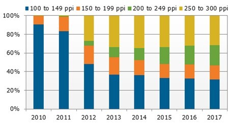 隨著市場發(fā)展,平板電腦本身規(guī)格也不斷地的進(jìn)步。更高的像素將使平板電腦將具有理想多媒體體驗(yàn)。在接下來幾個(gè)季度,面板的分辨率和像素將進(jìn)一步提高;我們預(yù)估,2012年200-300ppi像素的滲透率將達(dá)30%,到了2017年可達(dá)到47.5%。