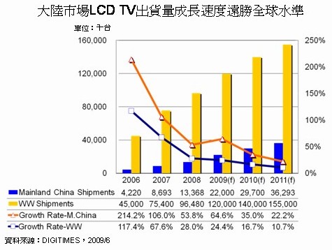 中國(guó)大陸LCD TV出貨增長(zhǎng)速度遠(yuǎn)高于全球平均水平(資料來(lái)源:DIGITIMES Research,2009年6月)
