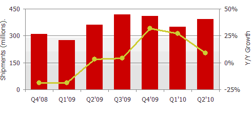 根據(jù)DisplaySearch最新一季手機面板出貨與預測報告指出,手機市場在2009年Q4強勁反彈,2009年手機面板全年出貨量達14億6千萬片,較2008年成長4.4%。而第四季手機面板出貨量為4億零9百萬片,較去年同期成長32%。雖然出貨量呈現(xiàn)正成長,但由于面板價格持續(xù)下滑的情況下,出貨金額僅達116億美元,較去年同期下跌4.7% 。