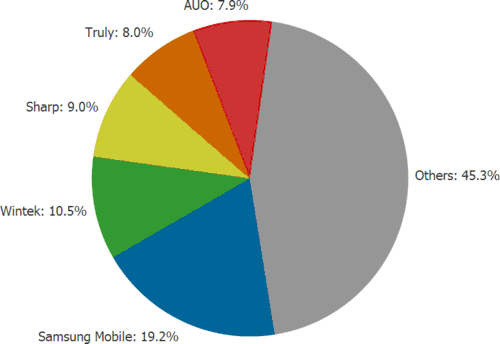下圖顯示了全球前5大手機面板供貨商的市占率,前五大廠商占有超過一半市場。三星排名第一,2009年出貨量市占率達19.2%,其次是勝華科技市占率10.5%,夏普排名第三市占率9.0%,信利與友達以8.0%及7.9%市占率分居第四與第五位 。