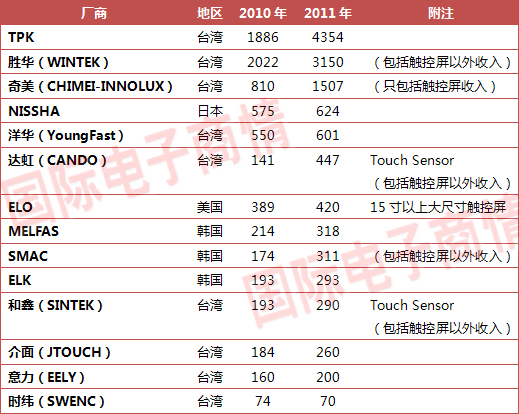 據(jù)水清木華研究中心最新報(bào)告,經(jīng)歷了2010年的爆發(fā)后,觸控屏行業(yè)開(kāi)始呈現(xiàn)兩極分化。大廠家的收入飛速增加,而小廠家收入微幅增長(zhǎng)甚至衰退。TPK和勝華兩大巨頭占據(jù)了行業(yè)的高端位置,以技術(shù)優(yōu)勢(shì)和客戶優(yōu)勢(shì)牢牢地占據(jù)了市場(chǎng)的大部分份額。雖然觸控屏整體市場(chǎng)在2011年繼續(xù)高速增長(zhǎng),但中小廠家卻很難從中獲益。2010年市場(chǎng)大好,使得不少企業(yè)都擴(kuò)大了產(chǎn)能,這樣不僅是電阻觸控屏出現(xiàn)激烈的殺價(jià)競(jìng)爭(zhēng),電容觸控屏也出現(xiàn)殺價(jià)競(jìng)爭(zhēng)。