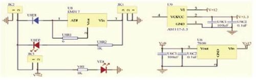電源采用12V/1000mAh的鋰電池,直接為傾角傳感器供電,再經(jīng)兩路DC-DC轉(zhuǎn)換,分別轉(zhuǎn)換至9V和3.3V,9V電源為無(wú)線數(shù)傳模塊供電,3.3V為主控制器及接口電路供電,充電電路采用LM317芯片,恒流方式充電。電源電路見(jiàn)圖4所示。