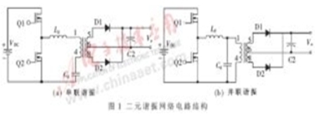 用兩個(gè)元件組成的諧振拓樸結(jié)構(gòu)主要有兩種:并聯(lián)結(jié)構(gòu)和串聯(lián)結(jié)構(gòu),分別如圖1(a)和圖1(b)所示。串聯(lián)諧振在輕負(fù)載時(shí)具有較高的效率,而在滿負(fù)載時(shí)轉(zhuǎn)換效率比較低;并聯(lián)諧振則反之,在滿負(fù)載時(shí)具有較高的轉(zhuǎn)換效率,而在輕負(fù)載時(shí)轉(zhuǎn)換效率比較低。而且串聯(lián)諧振和并聯(lián)諧振都要求較寬的頻率范圍。因此,這種二元的諧振網(wǎng)絡(luò)在實(shí)際應(yīng)用中都有一定的限制。