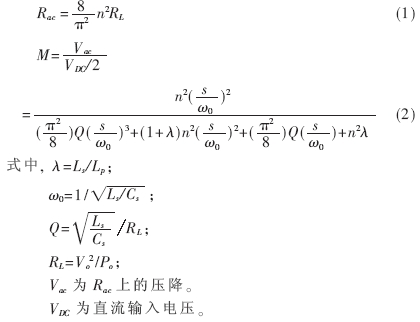 串聯(lián)電感Ls、并聯(lián)電感Lp和諧振電容Cs組成LLC諧振網(wǎng)絡(luò),在此必須注意到負(fù)載也參與了諧振。對(duì)其進(jìn)行建模,LLC簡化模型如圖2(b)所示,Ra c為副邊的負(fù)載折算到原邊的等效負(fù)載,折算公式見式(1)。因?yàn)樵呡斎腚妷簽榉讲?,電流為近似正弦波,而變壓器輸出電壓也是方波,電流也是正弦波,因此可以推?dǎo)出其電壓傳遞函數(shù),如式(2)所示。