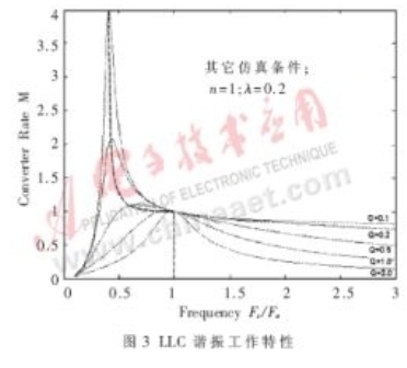 從圖3中可以看到,在整個(gè)頻率范圍內(nèi),既有降壓的工作區(qū)域(M<1),也有升壓的工作區(qū)域(M>1),因此LLC諧振有著較為廣闊的應(yīng)用范圍。在輕負(fù)載時(shí),工作頻率逐漸升高,工作在降壓區(qū)域內(nèi);而在重負(fù)載時(shí),工作頻率逐漸降低,工作在升壓區(qū)域內(nèi)。眾所周知,串聯(lián)諧振的工作區(qū)域是Fs/Fo>1,才能工作在ZVS的狀態(tài)下。從圖3中可以看到,在不同負(fù)載(即Q不同)下,為獲得ZVS的工作條件,只要使之工作在虛線的右側(cè)即可。而LLC諧振不僅僅局限于Fs/Fo>1區(qū)域,在某些負(fù)載下可以工作在Fs/Fo<1區(qū)域,同樣可以獲得零電壓轉(zhuǎn)換的工作狀況。并且與串聯(lián)諧振相比,在不同負(fù)載時(shí)的頻率變化范圍更小。因此,LLC諧振網(wǎng)絡(luò)有著其自身獨(dú)特的優(yōu)點(diǎn)。