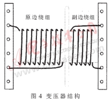 通過上面的分析知道,LLC諧振網(wǎng)絡(luò)需要兩個(gè)磁性元件Ls和Lp。然而,在實(shí)際應(yīng)用中,考慮到高頻變壓器實(shí)際結(jié)構(gòu),可以把磁性元件Ls和Lp集成在一個(gè)變壓器內(nèi),利用變壓器的漏感作為Ls,利用變壓器的磁化電感作為Lp。這樣一來,可以大大減少磁性元件數(shù)目。在設(shè)計(jì)時(shí),只要重點(diǎn)設(shè)計(jì)變壓器的漏感與變壓器磁化電感即可。因此,為增加漏感,需要在變壓器中加入適當(dāng)?shù)臍庀叮⑶铱刂谱儔浩髟边叺睦@線方式,如圖4所示。因?yàn)樽儔浩鞯脑吚@組與副邊繞組是完全分離的,因此無須使用隔離膠帶,這樣有助于形體的小型化。