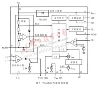 TEA1610是Philips公司推出的零電壓全諧振半橋控制器,是采用高壓DMOS工藝的芯片,高側(cè)開關(guān)管的驅(qū)動(dòng)耐壓最大可達(dá)600V,最大的振蕩頻率達(dá)1MHz。其內(nèi)部結(jié)構(gòu)如圖5所示。