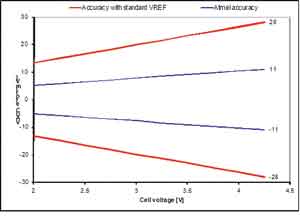 BM器件中常用的標準帶隙基準源針對額定變化被校準,在25℃時的精度極高。然而,曲率形狀和位置變化的補償也相當常見,這就產(chǎn)生與溫度變化有關(guān)的大幅變化,使得在高和低溫時電池電壓測量不夠精確。此外,也不可能檢測和顯示出曲線形狀顯著不同的離群點。