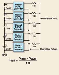 Aeroflex平衡電路使用共享總線,這個總線的電壓等于所有電池的平均電壓。平衡電路由那些超過共享總線電壓的電池充電并將電能注入到電壓較低的電池,這個工作是通過高效率的雙邊DC/AC轉(zhuǎn)換器來完成的。