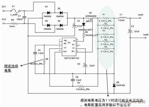 圖3:采用峰值電流控制的NCP1216非隔離型離線式LED驅(qū)動(dòng)應(yīng)用。