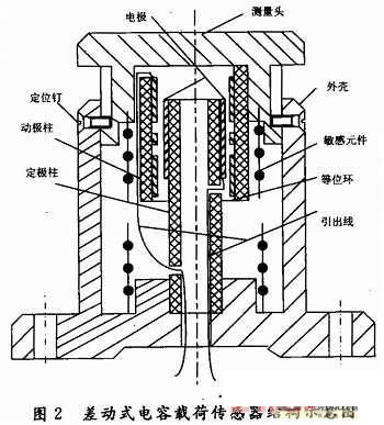 差動式電容載荷傳感器結(jié)構(gòu)示意圖如圖2所示。它主要由測量頭、外殼、敏感元件(彈性體)、定極柱、動極柱、電極、等位環(huán)、引出線等構(gòu)成。其特點(diǎn)為:測量范圍寬;靈敏度高,便于拾取信號;極板間不接觸、不變形、不磨損,機(jī)械損失小、壽命長;電容傳感器受溫度影響??;動態(tài)性能好;結(jié)構(gòu)簡單、適應(yīng)各種惡劣環(huán)境和場合。