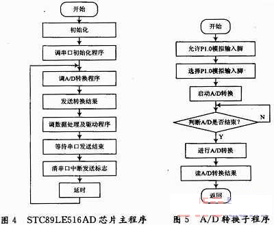 數(shù)據(jù)的采集與處理單元采用自帶A/D轉(zhuǎn)換器的STC89LE516AD單片機(jī)芯片,完成數(shù)據(jù)采集、模數(shù)轉(zhuǎn)換、數(shù)據(jù)處理以及驅(qū)動顯示單元。當(dāng)時(shí)鐘在40 MHz以下時(shí),每17個(gè)機(jī)器周期可完成一次A/D轉(zhuǎn)換。STC89LE516AD單片機(jī)與差動脈沖寬度調(diào)制集成電路結(jié)合起來,完成電容傳感器的檢測。其主程序和A/D轉(zhuǎn)換程序流程圖如圖4,圖5所示。