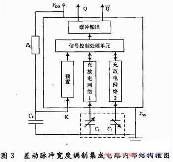 差動式電容載荷傳感器是將被測載荷的變化轉(zhuǎn)換為電容量的變化輸出,而電容傳感器所產(chǎn)生的電容量很微小,電容極板引線與地之間產(chǎn)生的雜散電容往往大于被測電容。因此小電容轉(zhuǎn)換測量技術(shù)一直被人們所重視。然而,一般的檢測電路結(jié)構(gòu)比較復(fù)雜,精確度較低,不能滿足測量要求。為了提高測量的靈敏度,針對差動式電容載荷傳感器,在基于四相檢測技術(shù)的電荷轉(zhuǎn)移式電容檢測電路的基礎(chǔ)上,設(shè)計(jì)采用了差動脈沖寬度調(diào)制集成測量電路,該電路具有集成度高、實(shí)現(xiàn)了電容傳感器頭有源化、輸出脈沖方波、省去高頻激勵(lì)信號源、功耗低、抗干擾能力強(qiáng)、分辨率高等特點(diǎn),尤其適合差動式電容傳感器的測量。其內(nèi)部結(jié)構(gòu)框圖如圖3所示,圖中的虛線框內(nèi)為差動式電容傳感器的兩個(gè)可變電容C1和C2。