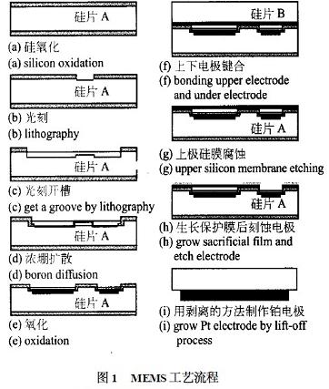 硅電容式壓力傳感器的敏感元件是半導(dǎo)體薄膜,它可以由單晶硅、多晶硅等利用半導(dǎo)體工藝制作而成。典型的電容式傳感器由上下電極、絕緣體和襯底構(gòu)成。當(dāng)薄膜受壓力作用時,薄膜會發(fā)生一定的變形,因此,上下電極之間的距離發(fā)生一定的變化,從而使電容發(fā)生變化。但電容式壓力傳感器的電容與上下電極之間的距離的關(guān)系是非線性關(guān)系,因此,要用具有補(bǔ)償功能的測量電路對輸出電容進(jìn)行非線性補(bǔ)償。由于高溫壓力傳感器工作在高溫環(huán)境下,補(bǔ)償電路會受到環(huán)境溫度的影響,從而產(chǎn)生較大的誤差?;谀P妥R別的高溫壓力傳感器,正是為了避免補(bǔ)償電路在高溫環(huán)境下工作產(chǎn)生較大誤差而設(shè)計的,其設(shè)計方案是把傳感器件與放大電路分離,通過模型識別來得到所測環(huán)境的壓力。高溫工作區(qū)溫度可達(dá)350℃。傳感器件由鉑電阻和電容式壓力傳感器構(gòu)成。其MEMS工藝如下: