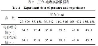 1可見,擬合的電容誤差小于1%。由此可見,在不同的時刻測得UO(t),通過曲線擬合得出參數(shù)RC。再給電路加小信號直流電源,測出R值,即求得C,通過C值則可知被測環(huán)境的壓力。圖5為350℃時,不同的壓力所對應(yīng)的電容的理論值和實(shí)驗(yàn)值,從實(shí)驗(yàn)數(shù)據(jù)(表2)可得,在測壓的過程中,利用模型識別的方法,誤差較小,其測壓誤差小于2%。