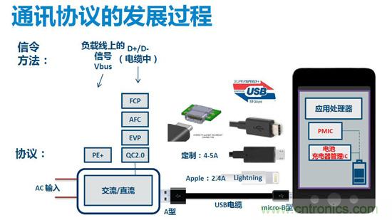 實現(xiàn)快充的前提是實現(xiàn)充電器端和手機端進行通訊,如此便涉及到通訊協(xié)議的問題。協(xié)議不同接口會有所差異,針對不同的協(xié)議接口,PI有不同的解決方法,在USB電纜中,指令通過數(shù)據(jù)線傳輸,數(shù)據(jù)線根據(jù)不同的通訊協(xié)議要求,通過D+、D-傳送指令信號,這種方式最早應(yīng)用于高通公司的QC2.0協(xié)議,目前已經(jīng)進展至QC3.0版本,進一步對快充性能進行了優(yōu)化。而即將興起的USB-PD協(xié)議,則可以完全實現(xiàn)雙向通訊,且其傳輸功率可以進一步增加,應(yīng)用前景將更加廣闊。相信在很多充電應(yīng)用領(lǐng)域會被廣泛采用。