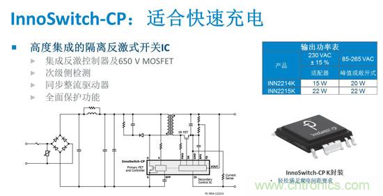 “目前PI提供兩種型號的InnoSwitch-CP器件。INN2214K IC提供15W輸出功率,適用于通用輸入電壓范圍的充電器和適配器應(yīng)用,而更大型號的INN2215K在同類應(yīng)用中可提供最大22 W的輸出功率。” Jason介紹說。