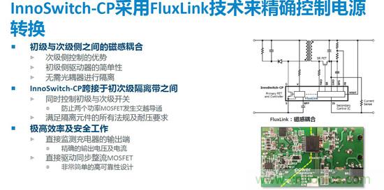 此次最新發(fā)布的InnoSwitch-CP采用Fluxlink技術(shù)來精確控制電源輸出特性,是典型的次級側(cè)控制方式的電源方案。IC內(nèi)部初次級側(cè)各有一個控制器,初級側(cè)還集成了一個功率MOSFET,,次級側(cè)控制器實現(xiàn)對輸出電壓和電流的監(jiān)測,根據(jù)監(jiān)測結(jié)果將信息反饋至初級,進行相應(yīng)的開關(guān)控制,從而實現(xiàn)更精確的輸出電壓和電流的控制。此外InnoSwitch-CP配置了次級側(cè)的同步整流驅(qū)動技術(shù),可以大大提升電源效率,改善充電器溫升。采用次級側(cè)控制器同時控制初級和次級兩個開關(guān)管的開關(guān),可以防止某些情況下可能出現(xiàn)的兩個開關(guān)管同時開通的現(xiàn)象,從而避免災(zāi)難性的故障發(fā)生。相對于其它采用兩個控制器分別控制初級和次級MOSFET的方案,InnoSwitch-CP可以實現(xiàn)更加可靠的同步整流工作控制,任何情況下都不會出現(xiàn)初級和次級兩個開關(guān)同時導(dǎo)通的情況,從而大大提高可靠性。
