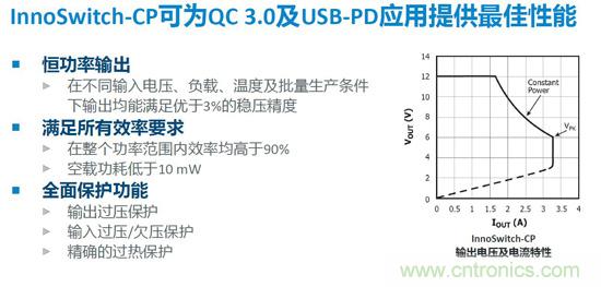 不管提高電流還是電壓,最終目的都是提高輸出功率,PI全新產(chǎn)品InnoSwitch-CP系列實現(xiàn)18w恒功率輸出,降低線路上的損耗,改善手機發(fā)熱,實現(xiàn)真正快速充電。