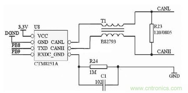 CAN-bus接口電路采用+3.3V供電,選擇CTM8251A隔離CAN收發(fā)器。該芯片是3.3V工業(yè)級的隔離CAN收發(fā)器。CTD0信號連接主控芯片的CAN控制器的發(fā)送腳,CRD0信號連接CAN控制器的接收腳。CTM隔離CAN收發(fā)器內(nèi)有一完整的CAN-bus隔離收發(fā)器電路,可以將來自CAN控制器的邏輯電平轉(zhuǎn)換為CAN總線信號,并具有DC2500V隔離功能。另外,CTM收發(fā)器可以選擇集成ESD保護功能的“T”系列,從而省略外擴的ESD保護器件。共模扼流圈T1起著EMI增強的功能,用于提高設(shè)備的EMI能力;共模扼流圈T1的電感參數(shù)很重要,選擇CAN-bus專用器件,比如EPCOS的B82793扼流圈。
