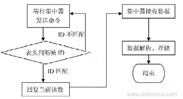 對時成功后,集中器繼續(xù)等待上位機的讀數(shù)命令或等待中斷讀數(shù)命令。當收到讀數(shù)的命令后,定時讀數(shù)使集中器按設(shè)置的時間,自動讀取表頭采集來的數(shù)據(jù);讀數(shù)使集中器讀取當前表頭的數(shù)據(jù)。