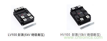 首次亮相展會的X系列雙管HVIGBT模塊,采用CSTBTTM 結(jié)構(gòu)的第7代IGBT和RFC二極管,降低功率損耗;運(yùn)用可降低內(nèi)部電感的封裝技術(shù),優(yōu)化產(chǎn)品性能;使用兩種封裝(LV100/HV100),實(shí)現(xiàn)兩種絕緣耐壓(6kV/10kV),但兩者具有相同的外形尺寸。LV100封裝包括900A/1.7kV和450A/3.3kV;HV100封裝包括450A/3.3kV、330A/4.5kV和225A/6.5kV;可提高系統(tǒng)結(jié)構(gòu)設(shè)計(jì)的靈活性,方便實(shí)現(xiàn)逆變器擴(kuò)容。