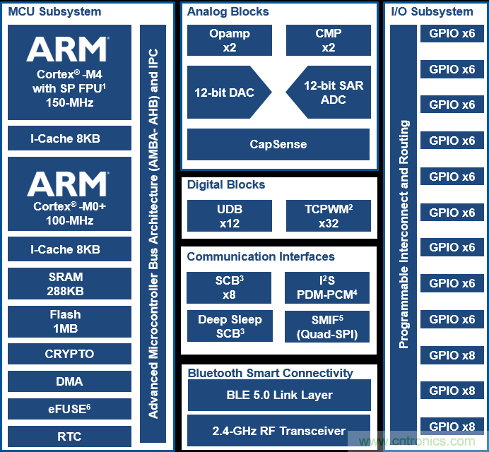 擴(kuò)充處理器容量、內(nèi)存及功耗方面的性能不會(huì)憑空而來(lái)。對(duì)于許多應(yīng)用程序而言,底層硬件(例如MCU)需要做出相應(yīng)調(diào)整以適應(yīng)這些特性。因此,生產(chǎn)商在設(shè)計(jì)下一代MCU時(shí)必須時(shí)刻緊記這些要求。例如,賽普拉斯 PSoC 6 BLE MCU(見圖1)為物聯(lián)網(wǎng)設(shè)計(jì)人員提供BLE 5.0所具備的這些功能。