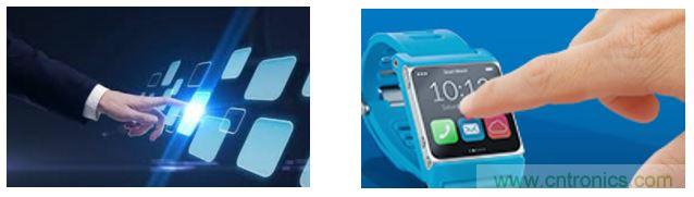 電容式觸摸顯示屏 ─觸摸顯示屏為中型及大型的物聯(lián)網(wǎng)設(shè)備提供豐富的用戶界面。從微波爐到手持式醫(yī)療設(shè)備,從智能手表到工業(yè)控制器等等。通常,使用電容觸摸技術(shù)結(jié)合顯示屏上透明的銦錫氧化物層(ITO)來(lái)實(shí)現(xiàn)觸摸顯示屏。依據(jù)這種應(yīng)用方式,電容式觸控技術(shù)要求能夠在潮濕的環(huán)境下工作。