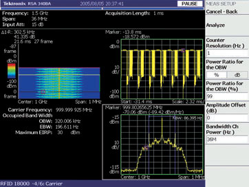政府規(guī)定要求控制發(fā)射信號(hào)的功率、頻率、帶寬。這些規(guī)定防止有害干擾并保證每個(gè)發(fā)射者都是頻帶內(nèi)其他用戶的友好鄰居。對(duì)于許多頻譜分析儀特別是通常用于脈沖信號(hào)能量測量的掃頻頻譜分析儀,進(jìn)行此類測量是具有挑戰(zhàn)性的。RTSA 能夠分析一個(gè)完整的分組發(fā)射過程的能量特點(diǎn),也能直接測量跳頻信號(hào)的載波頻率,而無需將信號(hào)置于一個(gè)跨度的中心。按一下按鍵,分析儀就能識(shí)別一個(gè)瞬時(shí) RFID 信號(hào)的調(diào)制方式并能夠?qū)β?、頻率和帶寬進(jìn)行監(jiān)管測量,使預(yù)一致性(pre-compliance)測試過程變得非常靈活和方便 [參閱圖2]。預(yù)一致性測試有助于確保產(chǎn)品一次通過一致性測試,而無需重新設(shè)計(jì)和重新測試。