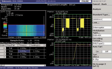 預(yù)編程測量能減少進(jìn)行這些測試所需的建立時(shí)間。例如,ISO18000-6 C 類型的一個(gè)重要測量是啟動(dòng)時(shí)間和關(guān)閉時(shí)間。載波能量上升時(shí)間必須足夠快以保證標(biāo)簽采集到使其正常工作的充足能量。信號(hào)也必須迅速達(dá)到穩(wěn)定狀態(tài)。發(fā)射結(jié)束時(shí),載波能量下降時(shí)間必須足夠快,以防止其他發(fā)射受到干擾 [參閱圖3]。