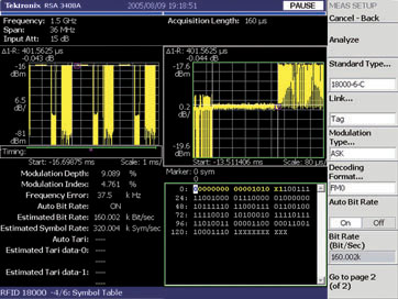 RTSA 也能解調(diào)與標(biāo)簽查詢相關(guān)的符號(hào)或比特。用戶只需選擇相應(yīng)的 RFID 標(biāo)準(zhǔn)、調(diào)制類型和解碼格式。分析儀能自動(dòng)檢測并顯示鏈路的比特率。為進(jìn)一步提高工程師的生產(chǎn)效率,對(duì)恢復(fù)出的數(shù)據(jù)符號(hào)進(jìn)行了基于功能的顏色編碼(color-coded)。RTSA 能夠自動(dòng)識(shí)別前導(dǎo)符并將那些符號(hào)染成黃色。這易于識(shí)別實(shí)際的數(shù)據(jù)負(fù)荷并與已知值進(jìn)行比較。