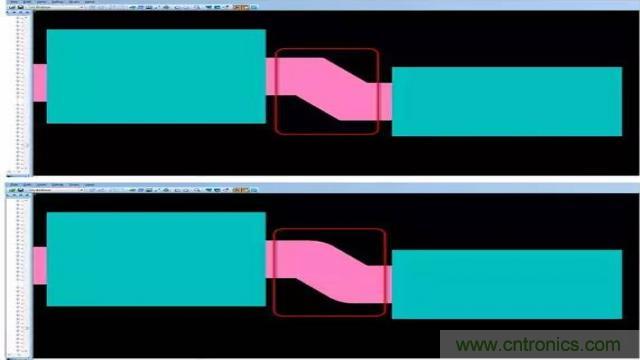 設(shè)計(jì)用于射頻和微波的銅皮形狀時(shí),一個(gè)很重要的方面是能夠創(chuàng)建帶尖拐角的Gerber 文件。優(yōu)秀的PCB設(shè)計(jì)工具可以簡(jiǎn)化這一過(guò)程。例如,使用50 毫米線(xiàn)條繪制形狀與使用50 毫米圓形光圈繪圖相比,往往令設(shè)計(jì)具有較小的半徑。設(shè)計(jì)工具在創(chuàng)建Gerber 文件時(shí),可通過(guò)正確地自動(dòng)轉(zhuǎn)換線(xiàn)條寬度來(lái)獲得尖拐角(圖2)。