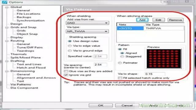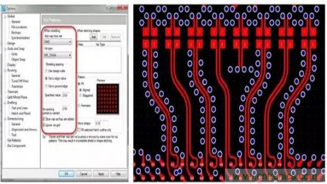 射頻設(shè)計(jì)的另一個(gè)重要方面是確保正確地屏蔽帶過(guò)孔的區(qū)域。盡管此任務(wù)可由設(shè)計(jì)人員手動(dòng)進(jìn)行,但這個(gè)過(guò)程極其耗時(shí)。如果PCB 設(shè)計(jì)工具能夠自動(dòng)完成此過(guò)程,將可以縮短設(shè)計(jì)周期時(shí)間并確保符合您的所有設(shè)計(jì)規(guī)則。利用此類(lèi)工具,設(shè)計(jì)人員可以指定過(guò)孔模式生成規(guī)則,而將剩余的工作全部交由PCB 設(shè)計(jì)工具完成。