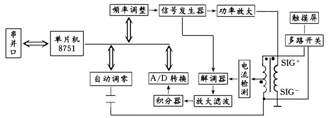 加到觸摸屏的右邊電極上,觸摸屏的上邊和下邊電極全部開路,這樣在觸摸屏的X 方向上建立了交流電壓梯度,經(jīng)解調(diào)器解調(diào)和濾波后,可得到X 方向上的觸摸電流為iX= KXXV/ Zf ,其中,V為變壓器次級對于中心抽頭虛地的電壓,KX 為常量,V/ Zf 為電路等價阻抗觸摸電流。第2 種模式為將SIG+加到觸摸屏的左邊電極上,同時也加到觸摸屏的右邊電極上,這時在X 方向上建立了均勻的交流電壓。如果在觸摸屏上任意一點(diǎn)進(jìn)行觸摸,則經(jīng)解調(diào)器解調(diào)和濾波后,得到其觸摸電流為i ZX= KZXV/ Zf ,其中,KZX為常量。由iX 和iZX得X 方向的觸摸位置坐標(biāo)為X= (KZX/ KX)·( iX/ i ZX ) ,式中,iX、iZX在以上2 種掃描模式下測得,而常量KZX/ KX 可由實(shí)驗(yàn)確定。一旦確定了KZX / KX,就可計(jì)算出X 方向的任意觸摸位置坐標(biāo)X。同樣,第3 種模式是將SIG+和SIG-分別加到觸摸屏的上邊電極和下邊電極上,即可得到Y(jié)方向上的觸摸電流為i Y= KYYV/ Zf ,其中,KY 為常量。第4種模式是同時將SIG+加到觸摸屏的上邊電極和下邊電極上,得等價阻抗觸摸電流為 iZY= KZYV/ Zf ,其中,KZY為常量。也可由 iY 和 iZY得Y 方向的觸摸位置坐標(biāo)為 Y=(KZY/ KY) ( i Y/ i ZX) ,其中,常量KZY/ KY 同樣可由實(shí)驗(yàn)確定。