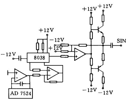 控制器的激勵信號源如圖3 所示。信號由函數(shù)信號發(fā)生器8038 產(chǎn)生,它能夠輸出正弦波和方波,正弦波用作觸摸屏的激勵信號。單片機(jī)通過 8 位 D/ A 轉(zhuǎn)換器可控制8038 的振蕩頻率,一般控制在200 kHz 左右,以避開計(jì)算機(jī)顯示器掃描信號產(chǎn)生的干擾。同時,由8038 產(chǎn)生的方波信號提供給模擬解調(diào)器,作為解調(diào)信號參考源。由于8038輸出的正弦波信號功率有限,為此在8038的正弦波信號輸出端增加了功率放大電路。